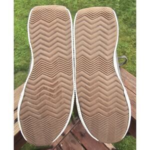 In pre-owned condition. Tag sz 9. The shoes are like a dark sage green color. Photos make them seem more gray.
