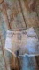 Stylish light blue denim shorts with detailed white design. Features a trendy frayed hem. Ideal for casual wear.