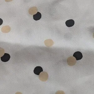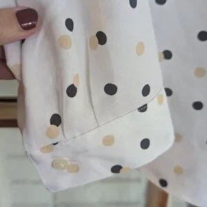 Ann Taylor Classic shirt with darts at bust and pleating at cuffs. New With Tags. No button at the top, producing a V-neck style that can't be fully closed. Tan and black polka dot pattern.