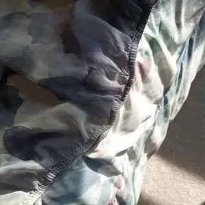 Chic sleeveless blouse with a tie-neck design. Features a black and gray floral pattern. Gathered elastic waist.