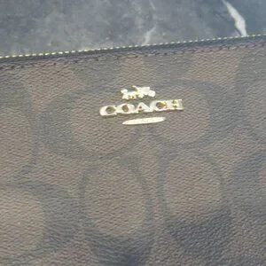 Classic Coach wristlet featuring the iconic brown Signature C coated canvas with gold-tone hardware and leather strap. Designed with a double zipper and two spacious compartments, this wristlet offers both style and organization. Perfect for carrying essentials on the go or slipping inside a larger bag.
