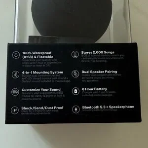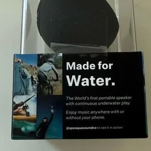 Black Speaqua waterproof Barnacle Pro 2.0 portable bluetooth speaker - NIB - 100% waterproof - stores 2000 songs - 4 in one mounting system - dual speaker pairing - 8 hour battery charge - floatable - brand new in box - received as a gift & never used - please not it says Barclays in tiny blue letters on the back bottom base