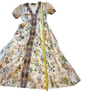 Romantic and timeless, this Anthropologie dress features intricate floral embroidery on a soft cream background with a beautifully detailed central panel. Designed with short puff sleeves, a flattering V-neckline, and a flowy midi silhouette. Fully lined with a hidden side zipper for a smooth fit.
