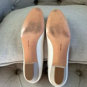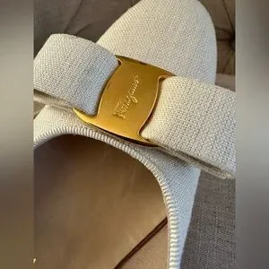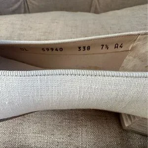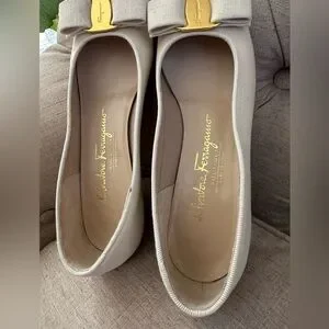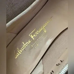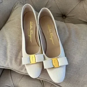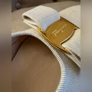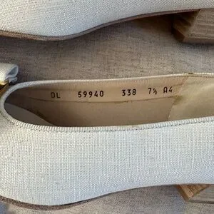 Amazing shape for their age! Vintage 90s Salvatore Ferragamo bow toe kitten heels. From the Boutique line. There are a couple of very faint spots from wearing, and there are a few scratches on the metal bow buckle - see pictures. Cream linen material, made in Italy. Size is 7 1/2, A4 width. They are narrow.