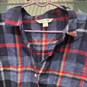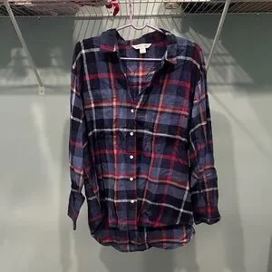 Stylish plaid button-up shirt with a classic design. Features a mix of blue, red, and white colors.