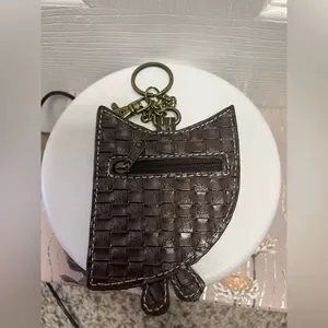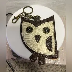Cute Chala leather owl-shaped keychain coin purse in cream and brown. Features intricate detailing and a secure clasp. Chala uses high quality leather.