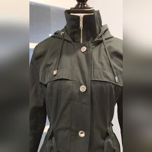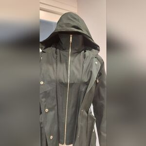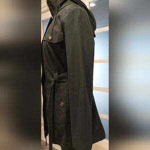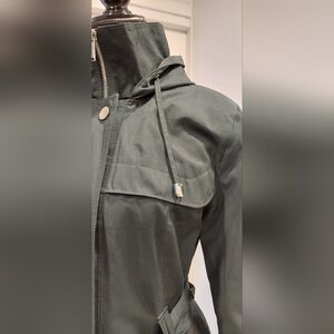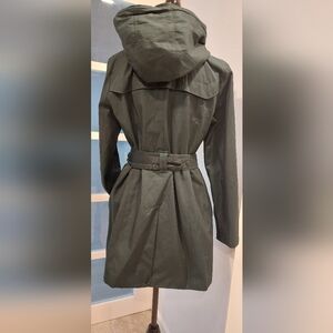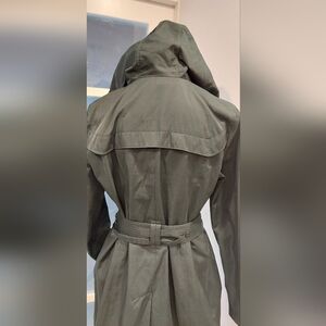 Elegant trench coat with sleek design. Features button accents and high collar. Perfect for any occasion.