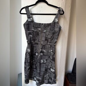 Chic mini dress with a newspaper text pattern. Perfect for stylish outings. Made of stretch denim.