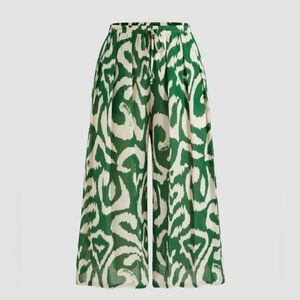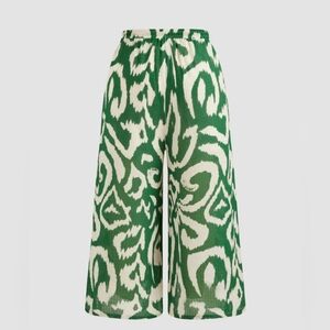 Stylish wide leg pants. Features a bold green and cream abstract pattern. Comfortable and chic.