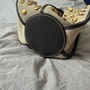 Stylish Tory Burch tote with gold studs. Beige body with elegant design. Perfect for any occasion.