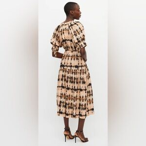 Pre-owned Ulla Johnson beige and black tie dye dress featuring puff sleeves with cinched cuffs and adjustable tie, adjustable strap at collar, V-neck, pleated panel at hip, slip pockets at waist, and adjustable belt at waist. Size medium, great condition