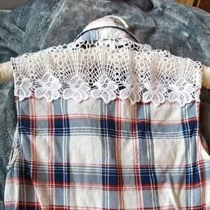 Charming sleeveless shirt with red and blue plaid. Features delicate lace on shoulders. Ideal for casual outings.