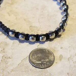 Black waxed cotton cord and silver acrylic beads bracelet is Shamballa macrame style. Beads are 6mm in diameter and bracelet is approximately 7 inches long with a button style clasp.
