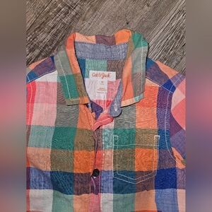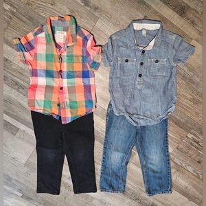 Stylish kids outfit set featuring a denim shirt with black pants and a colorful plaid shirt with blue jeans. Perfect for casual wear.