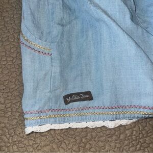 Matilda Jane Girls Chambray shorts, crochet trim, ruffle top Romper Sz 4 blue