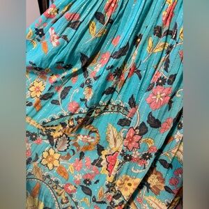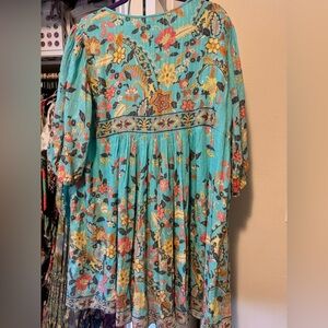 Chic turquoise mini dress with floral patterns. Features a flowy silhouette and short sleeves. Ideal for casual outings.