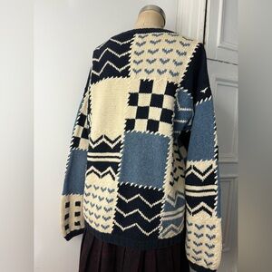 Navy and beige knit square multi print vintage button down cardigan from the 90s.