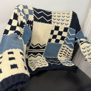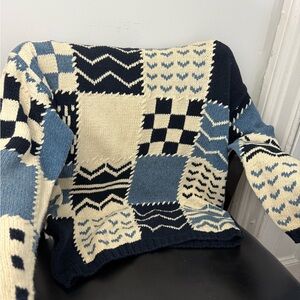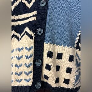 knit cardigan by Marsh Landing. Features navy and cream patterns. Perfect for cozy wear.