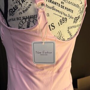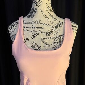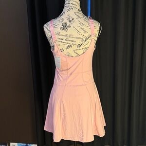 This elegant pink sleeveless tennis dress is perfect for any occasion. Its flattering fit and stylish design make it a must-have in your wardrobe. Biker shorts with a place for money or a phone . Light pink with built in pads .