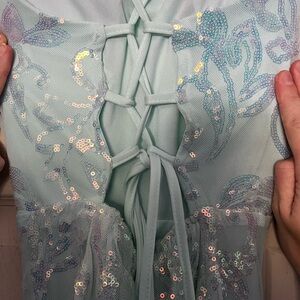 Stunning mint green gown with opalescent sequin details. Perfect for special occasions. Side slit. Worn Once