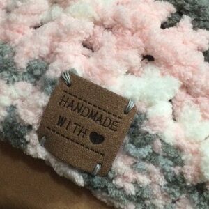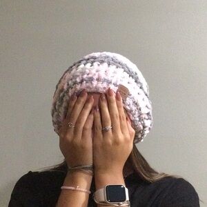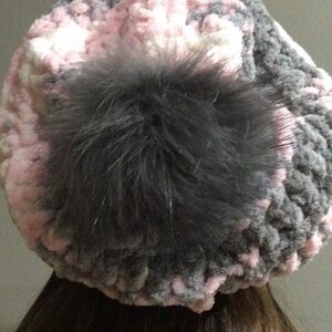 Elevate your winter style with this chic knitted handmade beanie. Featuring a delightful blend of pink and gray stripes, it's perfect for adding a touch of elegance to your cold-weather outfits. The playful pom pom completes the look. Width 11” Length: 12”