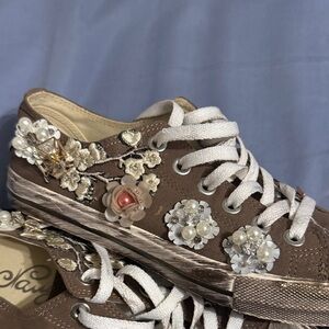 Stylish brown sneakers adorned with elegant embellishments. Perfect for adding a touch of flair to any casual outfit. NEW Naughty Monkey sneakers,,,bling on the sides…$20