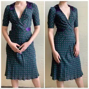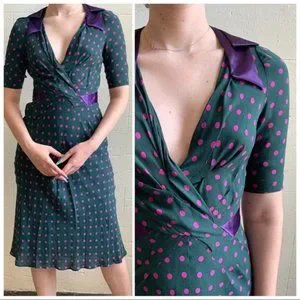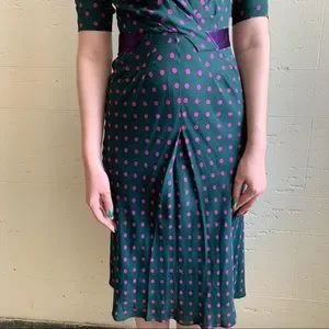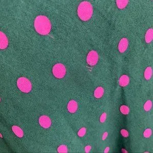 Emerald green, 100% silk, with hot pink polka dots. Purple accent.