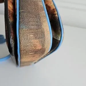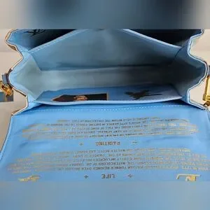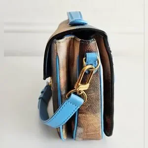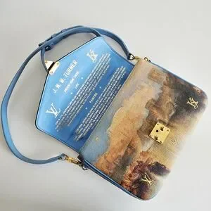 Authentic pre-owned Louis Vuitton Jeff Koons Turner pochette metis from the 2017 Masters Collection. This stunning bag has a rendition of a Turner painting on coated canvas, light blue calfskin leather trims and interior, goldtone Monogram fleurs/letters, and a detachable/adjustable crossbody leather strap.