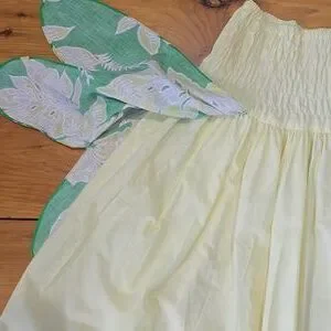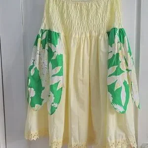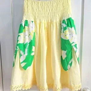 •The skirt has petal like long scalloped side panels in printed green fabric and a high waist that stretches to about 16.5".