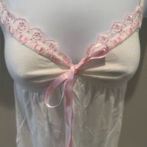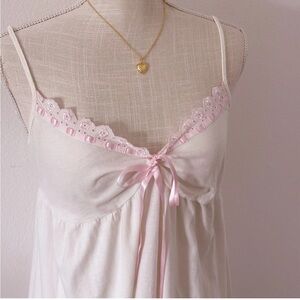 Soft cream chemise with delicate pink lace trim. Features a charming bow detail. Perfect for a cozy night.