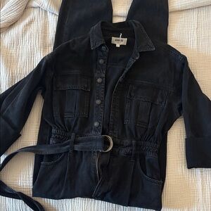 Stylish black jumpsuit by Agolde. Features a belted waist and button-up front. Perfect for a chic look. Standard size small - true to size.