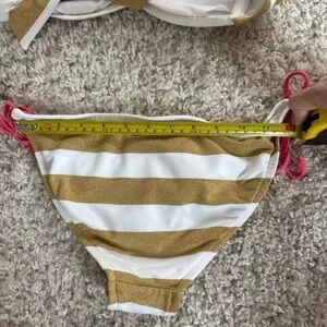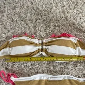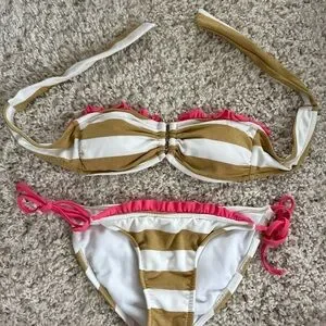 Chic bikini with gold and white stripes. Features a playful pink ruffle trim. Top is a medium with removable pads and tie back, bottoms are small side adjustable strings at side.