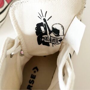 Limited Edition Classic white Converse high-tops with Girls Unite Graphic with black details. Fun Floral Bottom. Iconic design for everyday wear.