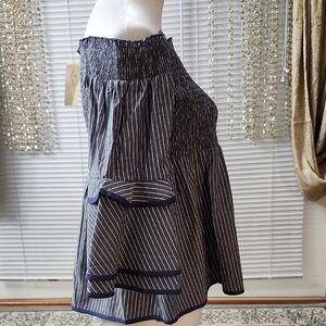 Chic off-shoulder blouse with navy stripes. Features ruffled sleeves and smocked top. Ideal for casual wear.