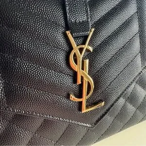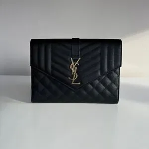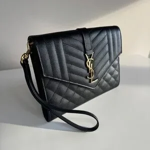 Chic black clutch with signature gold YSL logo. Quilted texture adds elegance. Ideal for evening wear.
