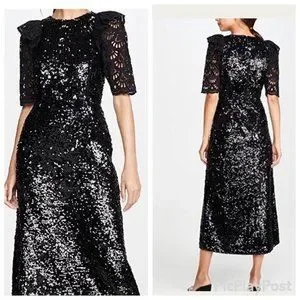 Black sequin midi dress with short lace puff sleeves. Features eyelet sleeves with ruffle trim, all over sequins, jewel neckline and hidden zip at back.