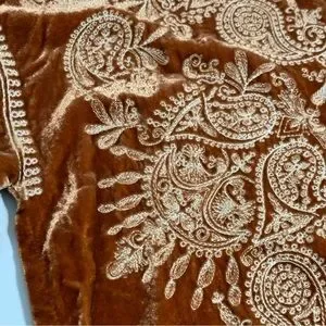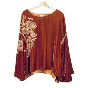 Elegant rust velvet tunic. Features intricate cream embroidery. Flowy and stylish design.