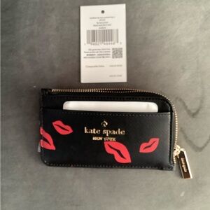 Chic card holder by Kate Spade. Black with playful red lips. Ideal for card organization.