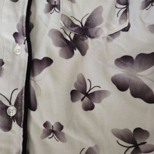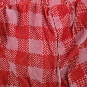 Art Class pajama set with fun designs. Red checkered, black floral, purple peace symbols, and blue cloud patterns. Perfect for cozy nights.