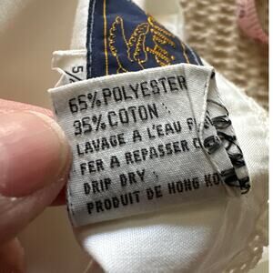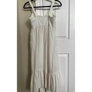 It's a white dress with buttons on the top, then hidden buttons under the bust seam. There is half of a hook and eye closure there, the other half is missing. Two pockets with embroidery. The straps are attached to the back of the dress by buttons. Lace ruffle detail at the top. It's so adorable!