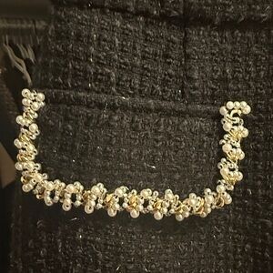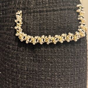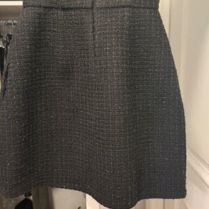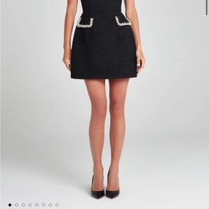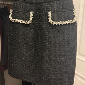 Chic black mini dress with elegant pearl embellishments. Perfect for stylish evenings. The material is a beautiful tweed, very rich looking, with a perfect silhouette. Fitted and molds to the body to show curves. Sexy and elegant