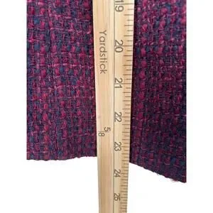 The LOFT Blazer is a stylish and versatile women's jacket in a size 10, featuring a burgundy blue wool tweed fabric with a collarless full zip design. Perfect for travel, casual, or business occasions, this blazer has a regular fit with long sleeves and features a pinstripe pattern and inner pockets. The 100% polyester lining ensures comfort, and the 23-inch inseam makes it a great addition to any pant suit ensemble. Made by LOFT, this blazer captures a classic and colorful theme, ideal for the winter and fall seasons.