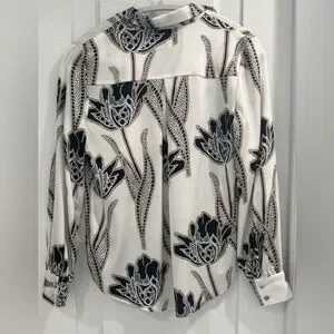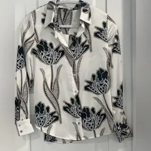 Stylish floral button-up blouse. See size chart, fabric contents and care instructions in photos. Perfect for any occasion.