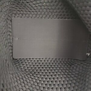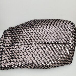 Woven silver tote with black backing. Detachable pouch included.