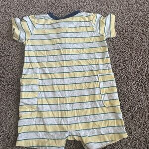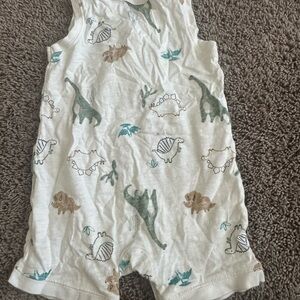 Set of colorful baby rompers featuring stripes, dinosaurs, and solid designs. Includes shades of blue, orange, yellow, and cream.