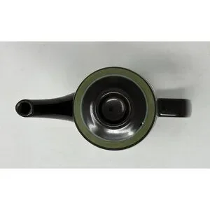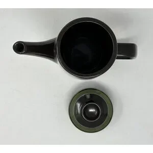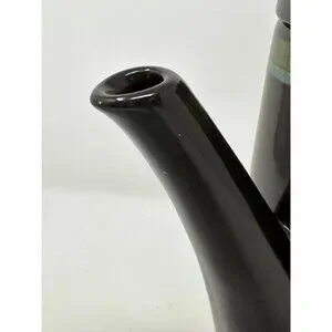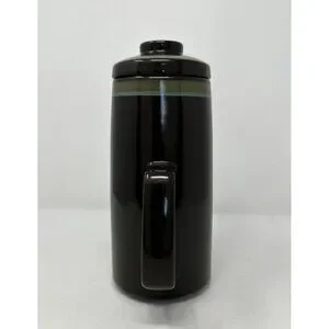 Lovely vintage Mikasa stoneware coffee/tea pot with lid in the #7501 Intaglio pattern – a dark brown body with a green and light blue band. Manufactured in the 1970s as part of the Majorca line, this beautiful coffee pot measures 9 5/8“ tall and 8 1/4” across from spout to handle. Marking states “Mikasa | Majorca | Intaglio 7501 | Oven To Table To Dishwasher | Japan.”