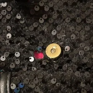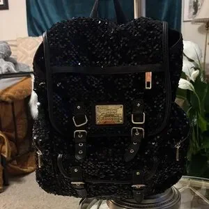 Elegant backpack adorned with black sequins. Features secure buckle closures and Juicy Couture branding.