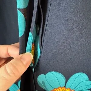 Banana Republic navy blue floral popover blouse, size XS. Blouse features a bold pattern of turquoise flowers with orange and yellow centers. Top has a buttoned cuff, a collar, and a few covered buttons up the front. Fabric is slightly sheer. In good pre-owned condition.