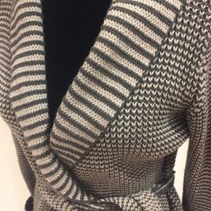 Stylish black and gray cardigan. Features a wrap design with a belt. Perfect for layering.