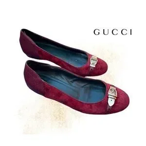 Gucci Women's Burgundy Suede Flats with gold Buckle Detail